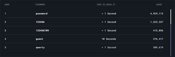 NordPass cho biết đa số mật khẩu chỉ là một từ đơn nên rất dễ bị bẻ khóa. Chỉ cần một chút kiến thức về các password phổ biến, không cần các chiêu trò hack phức tạp, các đối tượng xấu có thể dò ra các mật khẩu đơn giản này.