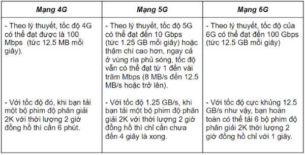 Mạng 6G là gì?Mạng 6G thế hệ thứ sáu, tiếp bước thế hệ 5G. Hiện chưa rõ tiêu chuẩn cụ thể, nhưng chúng ta hoàn toàn có thể suy đoán mạng 6G sẽ có những đặc điểm gì. Theo trang PCMag, các thế hệ mạng di động mới sử dụng các mã hóa kỹ thuật số tiên tiến. Ngoài ra, mạng 6G cũng hỗ trợ băng tần, độ phủ rộng và thông minh hơn. Mạng 6G có gì khác biệt?Sự khác biệt chúng ta có thể thấy rõ ràng nhất đó là tốc độ. Sau mỗi thế hệ mạng di động, tốc độ sẽ là yếu tố được cải thiện và mạng 6G cũng vậy. Mạng di động thế hệ thứ 6 sử dụng thiết bị tiên tiến hơn, có lượng sóng lớn và đa dạng hơn. Điều này gồm phổ tần số cao (Extreme High Frequency) mang lại tốc độ và dung lượng lớn. Để dễ hình dung, bạn có thể xem bảng so sánh tốc độ giữa mạng 4G, 5G và 6G như sau: